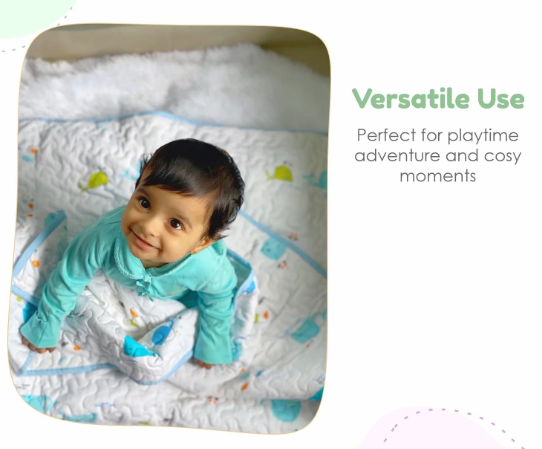Organic Cotton Baby Muslin AC Quilt/Blanket Crafted from the purest organic cotton, this exquisitely soft quilt offers unparalleled warmth and coziness, making it the perfect companion for babies aged 0-3 years. Versatile and practical, it serves as a plush AC blanket, stylish travel essential, a charming bedspread, or a cozy wrap, adapting effortlessly to every need. With eco-friendly dyes and a reversible design, our quilt not only pampers your baby’s delicate skin but also promotes sustainability. Adorned with delightful hand block prints, it makes for a thoughtful and elegant baby shower gift, sure to impress discerning parents-to-be.