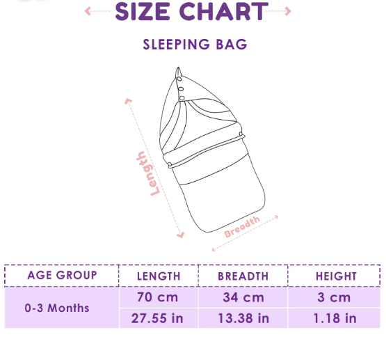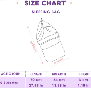 Sleeping Bag: (0-3 Months) This sleeping bag provides a secure sleeping space so your little one will be comfortable and rest well during naps and bedtime. Light in weight, it is also easy to carry and hence perfect for travel or outdoor activities.