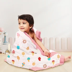 Blanket: (0-3 Years, 100×100 cm) A lightweight, breathable baby blanket made from soft, skin-friendly fabric—ideal for all seasons. Perfect for swaddling, cuddles, stroller cover, or nap-time comfort. Gentle on delicate skin and easy to wash for everyday use.