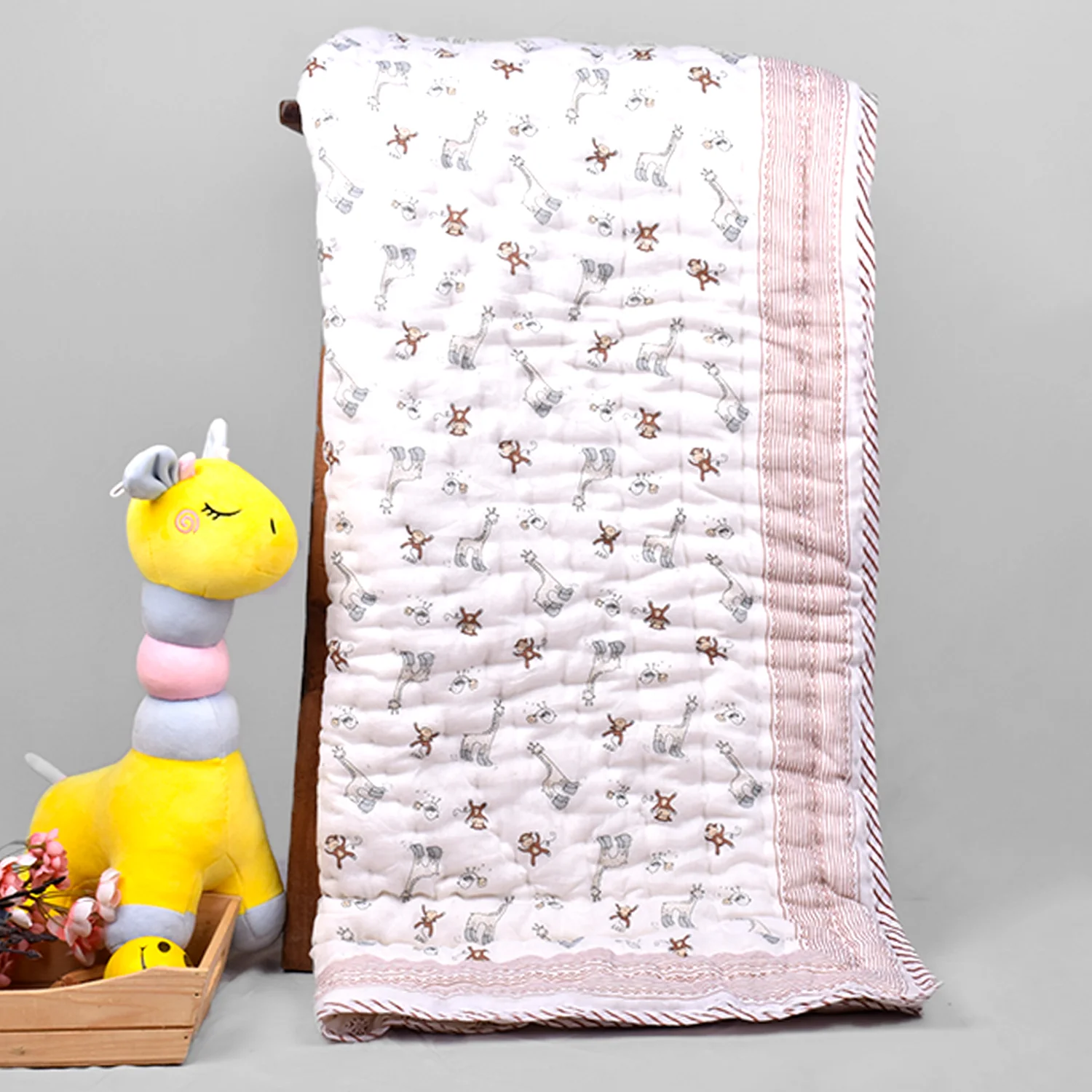 Organic Cotton Baby Muslin Quilt/Blanket Crafted from the purest organic cotton, this exquisitely soft quilt offers unparalleled warmth and coziness, making it the perfect companion for babies aged 0-5 years. Versatile and practical, it serves as a plush Baby blanket, a stylish travel essential, or a cozy wrap, adapting effortlessly to every need. With eco-friendly dyes and a reversible design, our quilt not only pampers your baby’s delicate skin but also promotes sustainability. Adorned with delightful hand block prints, it makes for a thoughtful and elegant baby shower gift, sure to impress discerning parents-to-be.