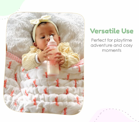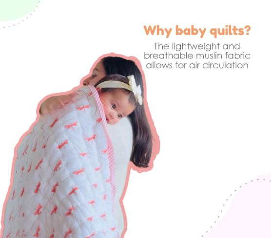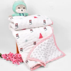 Organic Cotton Baby Muslin Quilt/Blanket Crafted from the purest organic cotton, this exquisitely soft quilt offers unparalleled warmth and coziness, making it the perfect companion for babies aged 0-5 years. Versatile and practical, it serves as a plush Baby blanket, a stylish travel essential, or a cozy wrap, adapting effortlessly to every need. With eco-friendly dyes and a reversible design, our quilt not only pampers your baby’s delicate skin but also promotes sustainability. Adorned with delightful hand block prints, it makes for a thoughtful and elegant baby shower gift, sure to impress discerning parents-to-be.