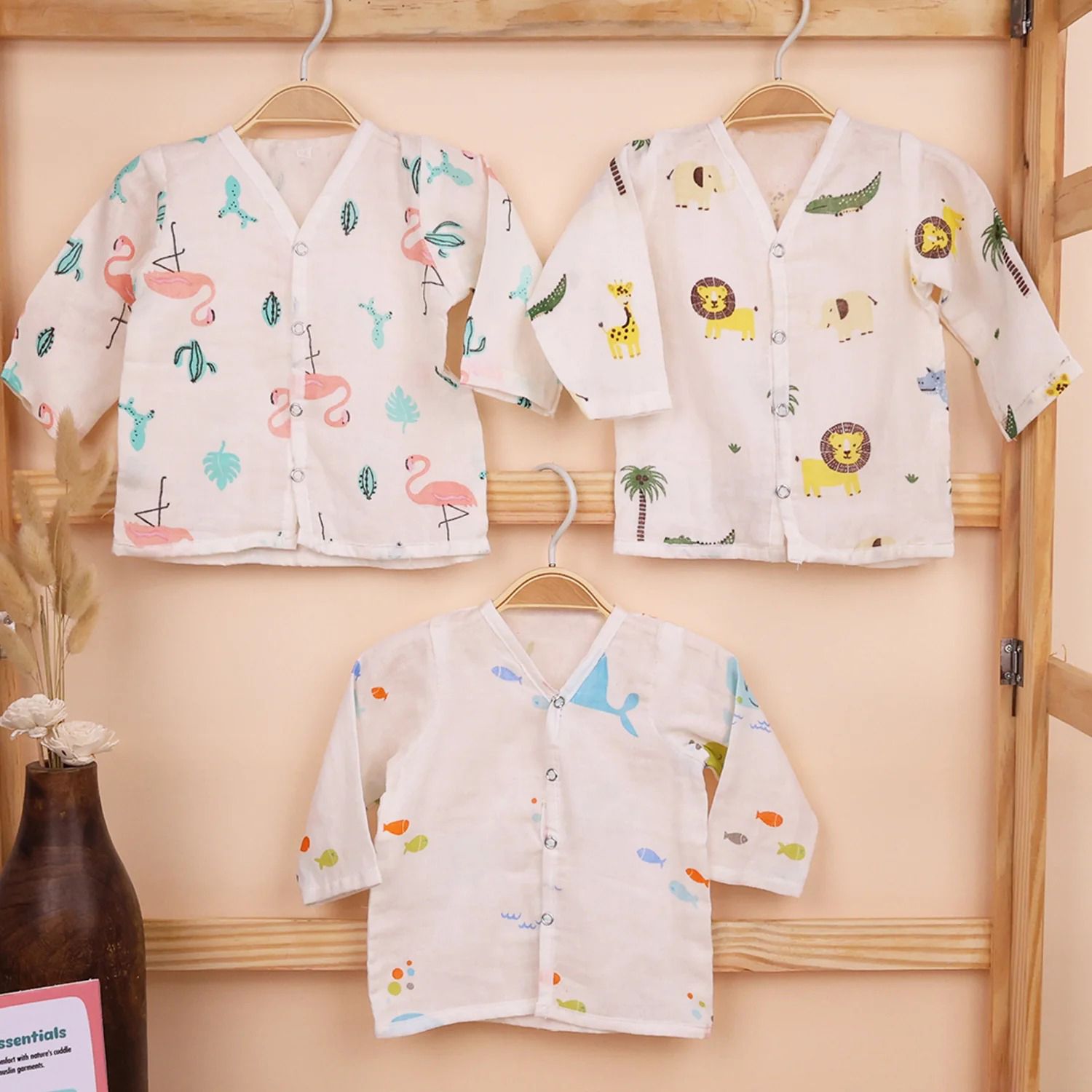 Baby Unisex Organic Cotton Muslin Full Sleeves Jhabla | Whale, Flamingo, Lion | Pack of 3