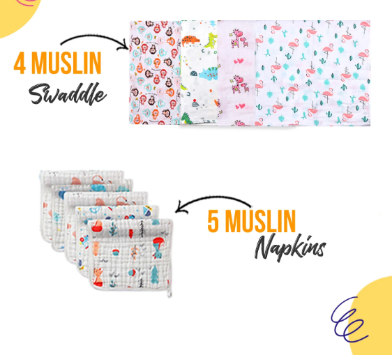 This 9 piece gift set consists of multi-coloured printed 4 organic muslin swaddle and 5 muslin napkins