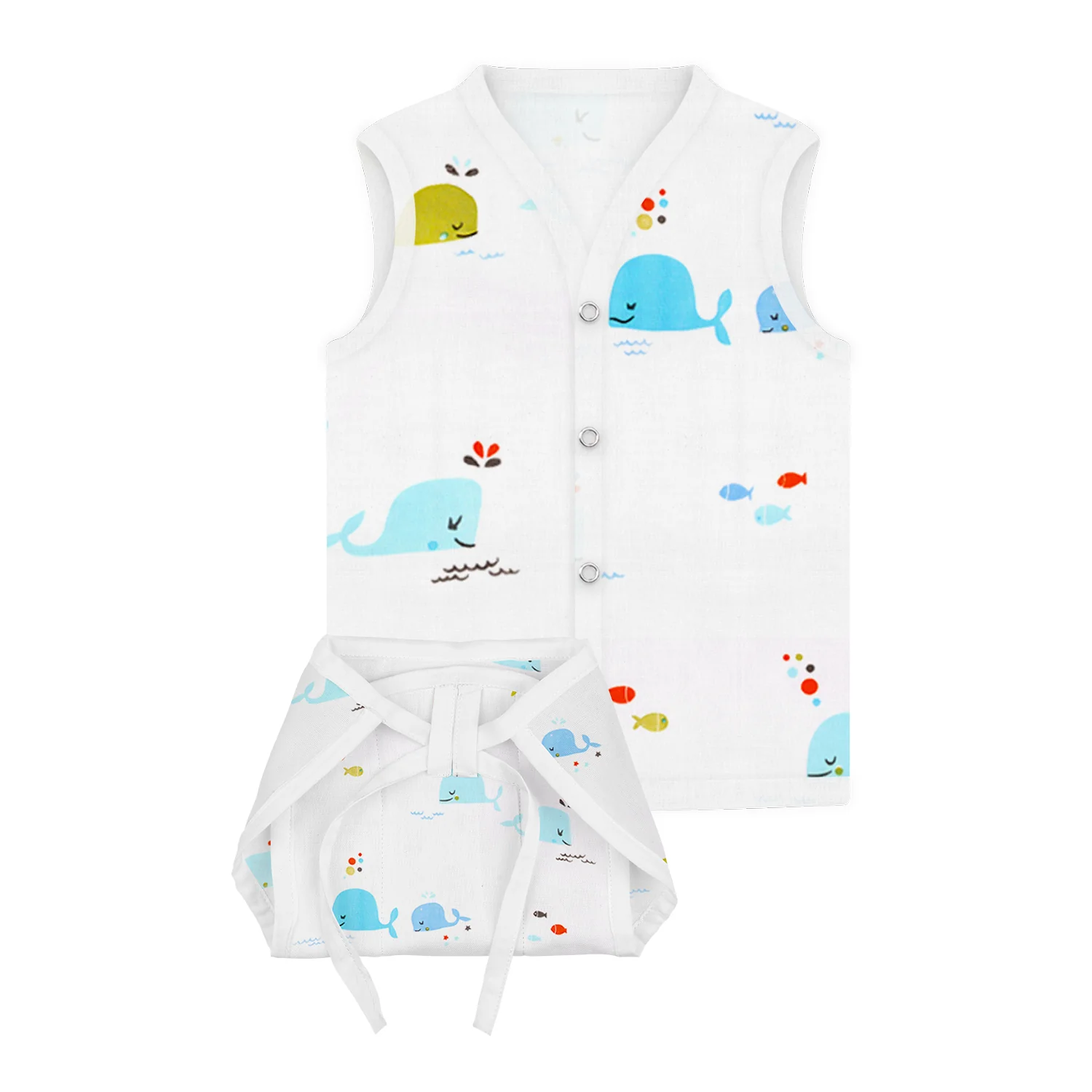 Jhabla and Nappy for New Born Baby | Baby Unisex Organic Cotton Muslin Jabla and Langot Set | Sleeveless Button Vest | Blue Whale