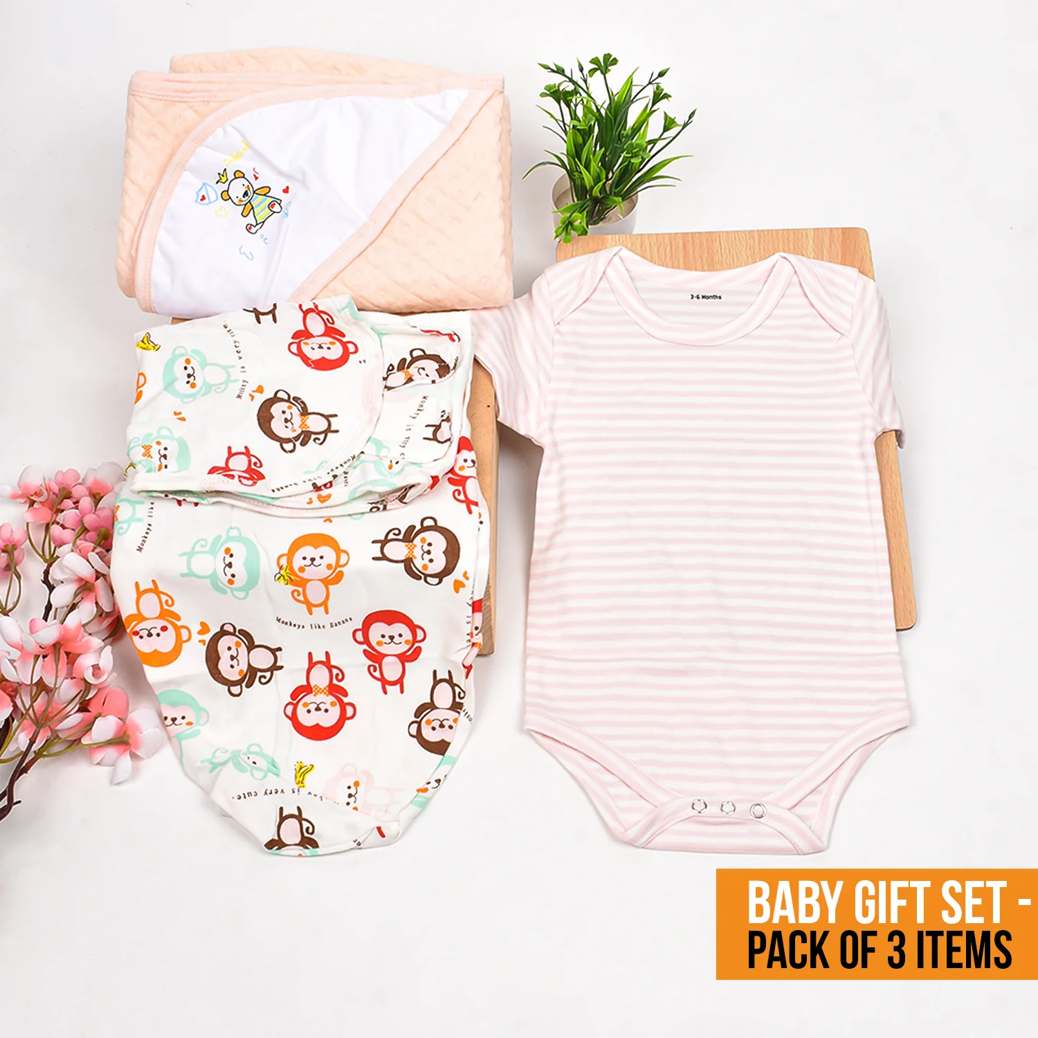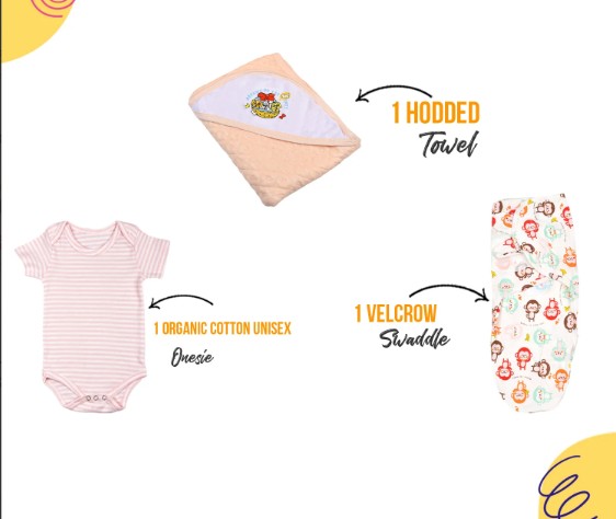 It includes: 1 Velcro Swaddle, 1 Onesie and 1 Hooded Towel.