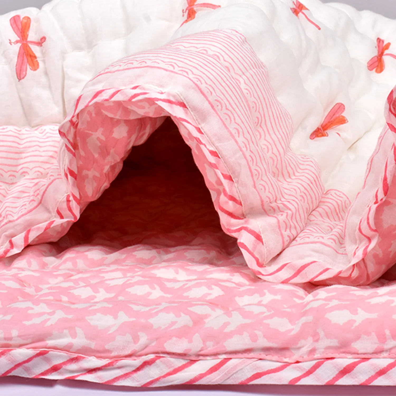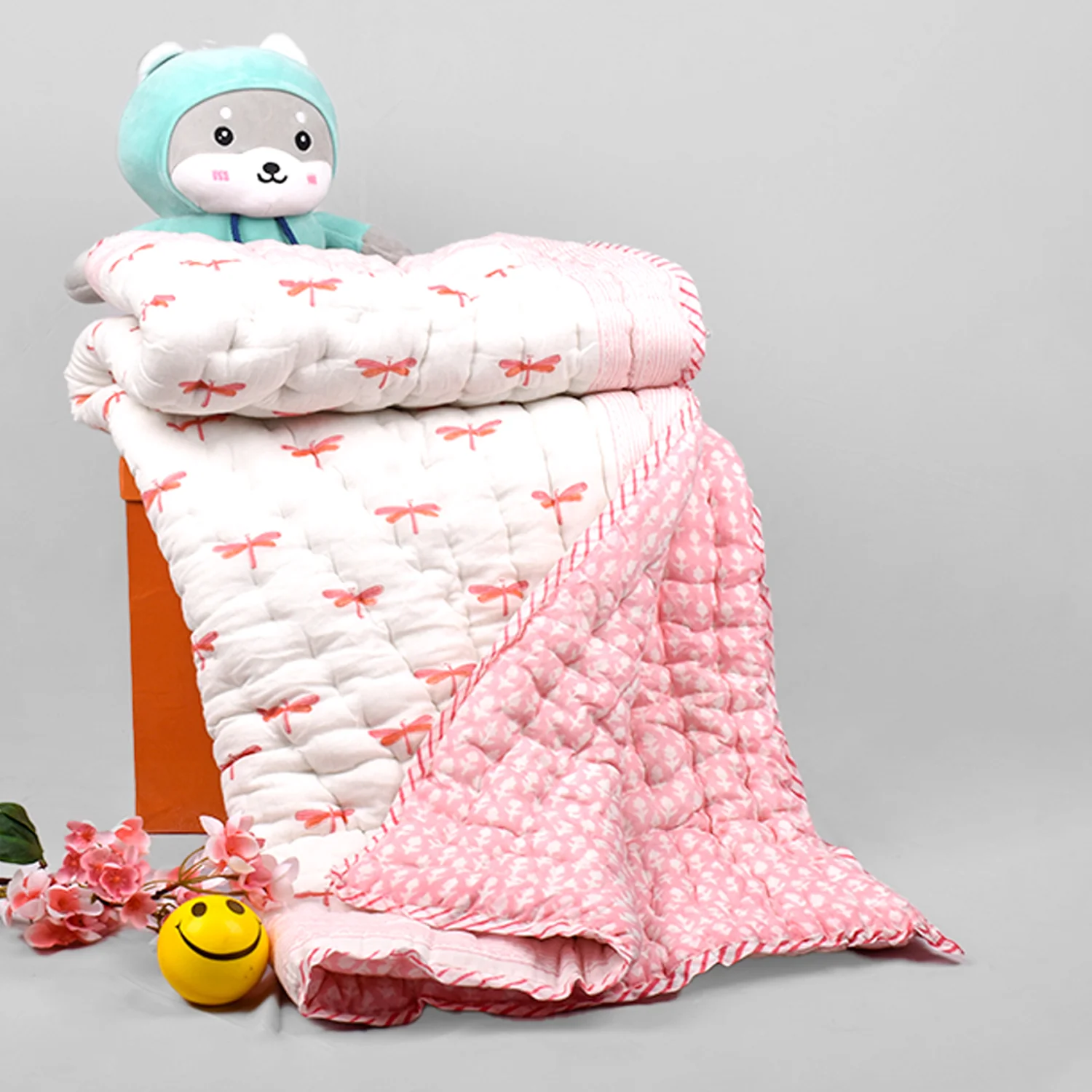 Organic Cotton Baby Muslin Quilt/Blanket Crafted from the purest organic cotton, this exquisitely soft quilt offers unparalleled warmth and coziness, making it the perfect companion for babies aged 0-9 years. Versatile and practical, it serves as a plush kid’s blanket, a stylish travel essential, or a cozy wrap, adapting effortlessly to every need. With eco-friendly dyes and a reversible design, our quilt not only pampers your baby’s delicate skin but also promotes sustainability. Adorned with delightful hand block prints, it makes for a thoughtful and elegant baby shower gift, sure to impress discerning parents-to-be.
