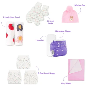 Includes: P1 Winter Romper, P1 Cotton Baba Suit (1 Top & 1 Pajama), Quilted Baby Suit (1 Top & 1 Pajama), P2 Muslin Swaddle, P1 AC Quilt, P1 Hooded Towel, P1 Pocket Diaper With 1 Insert, P1 Woolen Cap, P3 Cushioned Nappy, P3 Muslin Napkin, P3 Socks, P1 Dry Sheet, 1 Cap, 1 Mitten & 1 Booties, P1 Full Sleeve Onesie